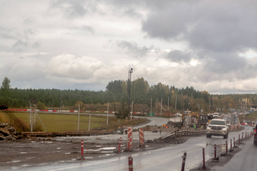 Здесь когда-то был пост ГАИ. Чинят мост через реку Сысерть