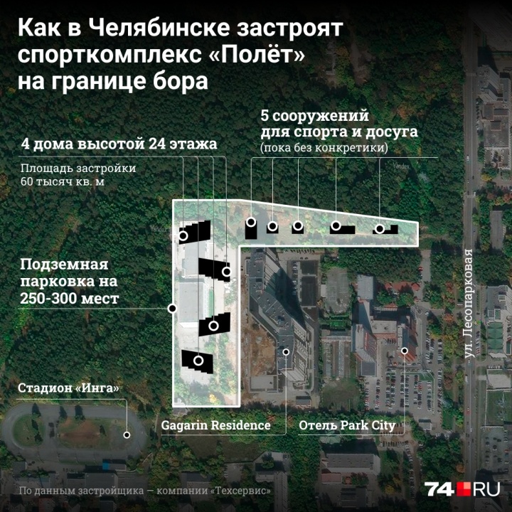 Комплексы апартаментов гостиничного типа планируется возвести на месте бывшего спорткомплекса «Полёт», развалин бассейна и автодрома. Инициаторы проекта также предложили концепцию развития парковой зоны. В районе улицы Лесопарковой предполагается разместить пять объектов для спорта и досуга. Об этом в четверг, 16 октября, на встрече с общественниками и чиновниками сообщила Екатерина Цветкова — представитель группы застройщиков, связанных с известным челябинским бизнесменом, ныне депутатом Госдумы Олегом Колесниковым. Общественники указали на определённое лукавство со стороны застройщика и попросили оставить лес лесом, а главный архитектор предложил уменьшить этажность будущих апартаментов.
