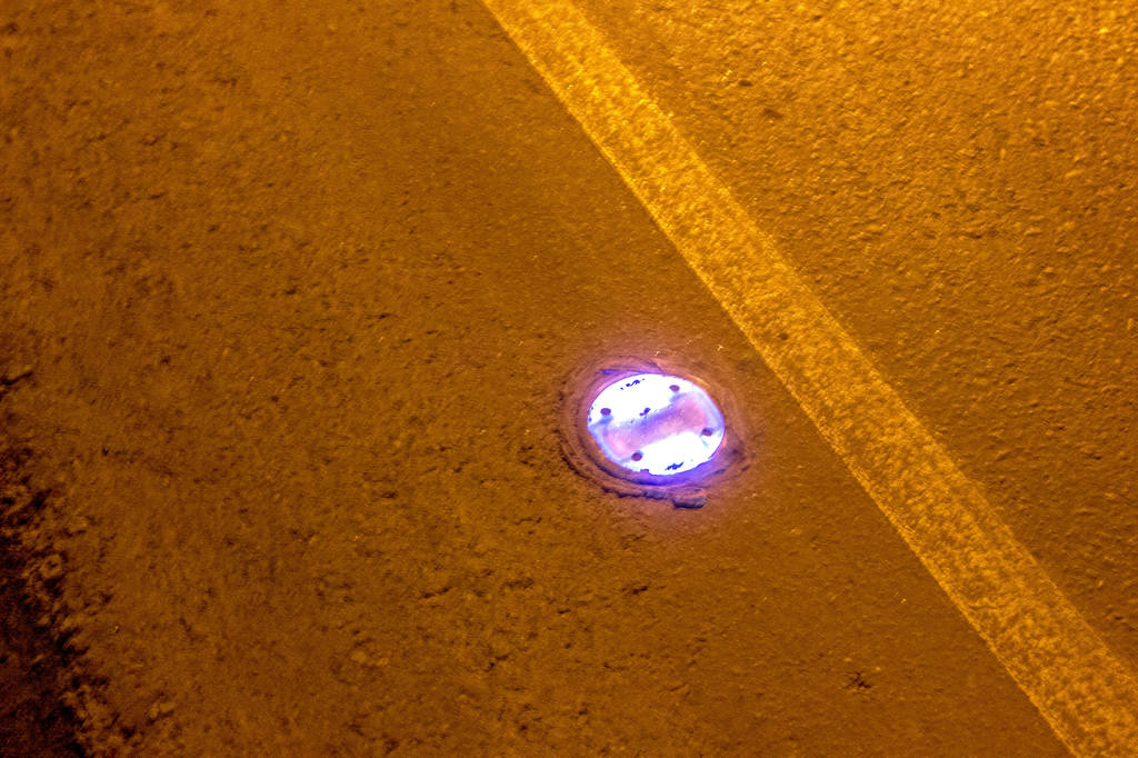 ЗЫ. Сначала думал что призмы-катафоты как на переходах. Погасил фары - всё равно мерцают. Вышел рассмотреть - вот эти самые круглые фонарики. За "стеклом" светодиоды мигают. И небольшая солнечная панелька (для "самозарядки" видимо).