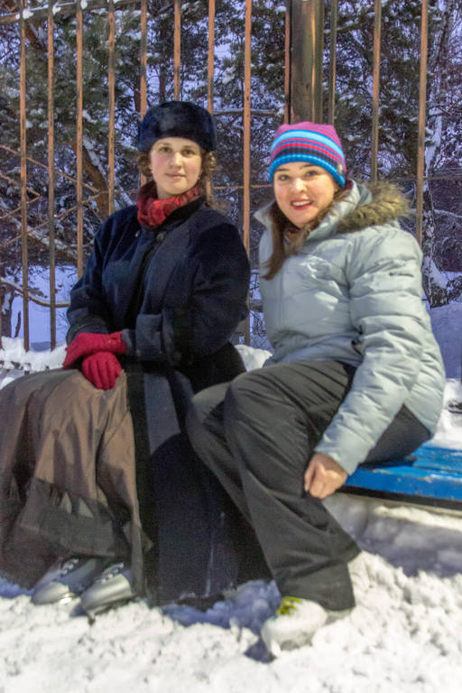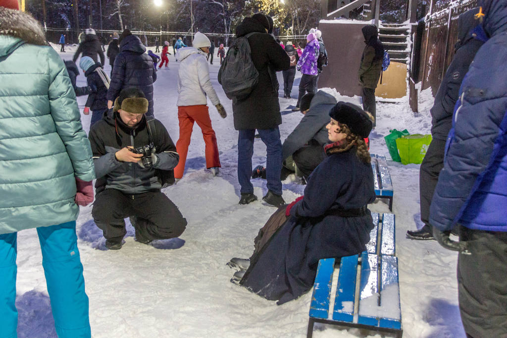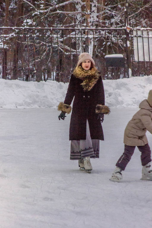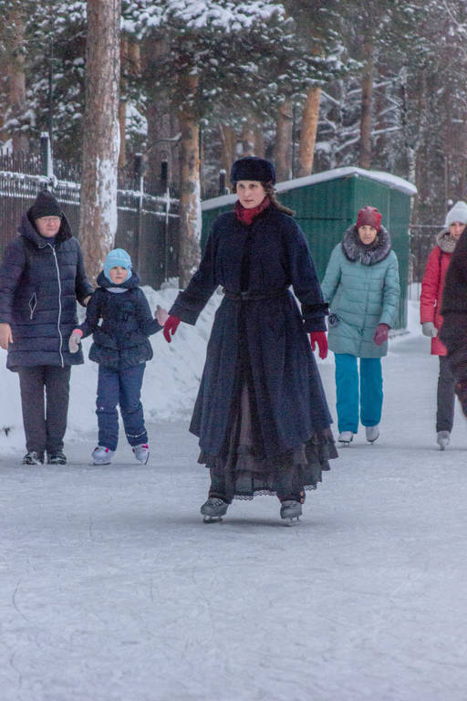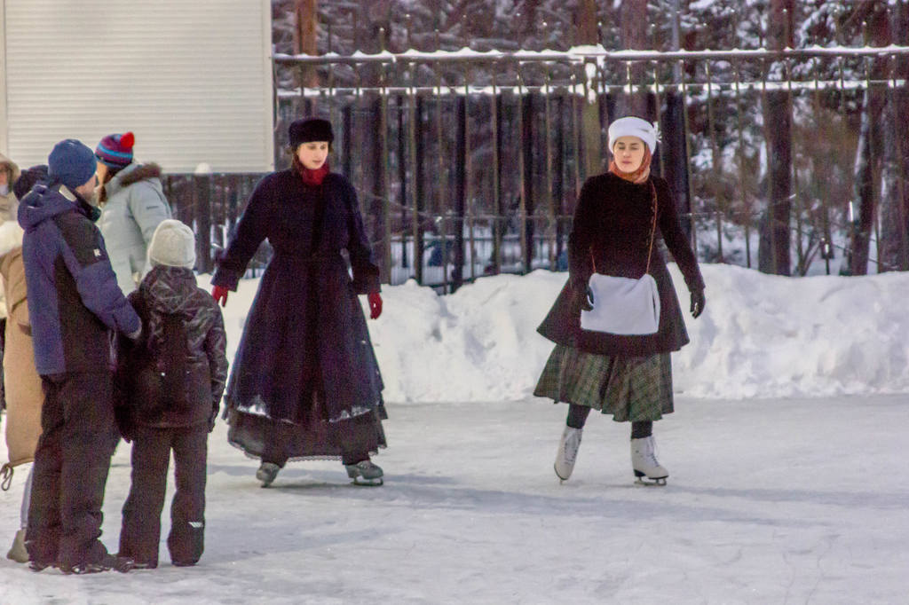На катке оживлённо. Привлекли внимание три дамочки в одеждах в стиле начала XX века. Косплееры? Реконструкторы?