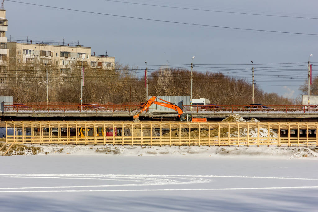 Сегодня попытался заснять реконструкцию Ленинградского моста - ни с какой стороны толком не подобраться, но что-то вроде получилось. А жёлтое решётчатое - это временный пешеходный мостик. Вот же забота пошла о людЯх - помнится, когда на Кировке мост перестраивали, никакими навесами не заморачивались