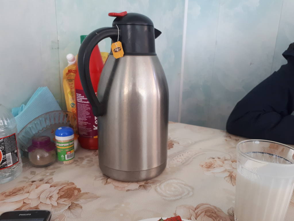 Чай входит в стоимость блюда и вот в таких термосах на столах стоит
