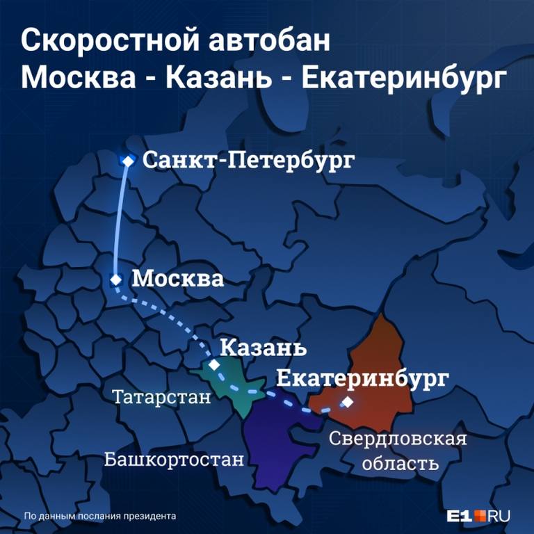 — Планируемая автомобильная дорога по кратчайшему маршруту соединит динамично развивающуюся агломерацию Казани и крупнейший город УрФО — Екатеринбург. Маршрут пройдет по территории республик Татарстан и Башкирия, а также Свердловской области. Населенные пункты прохождения маршрута на территории указанных регионов будут определены по результатам утверждения окончательной трассировки новой скоростной трассы, — подчеркнули в «Автодоре».