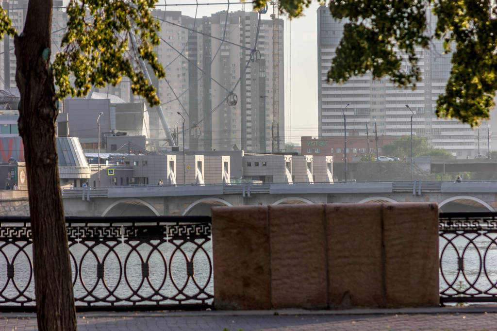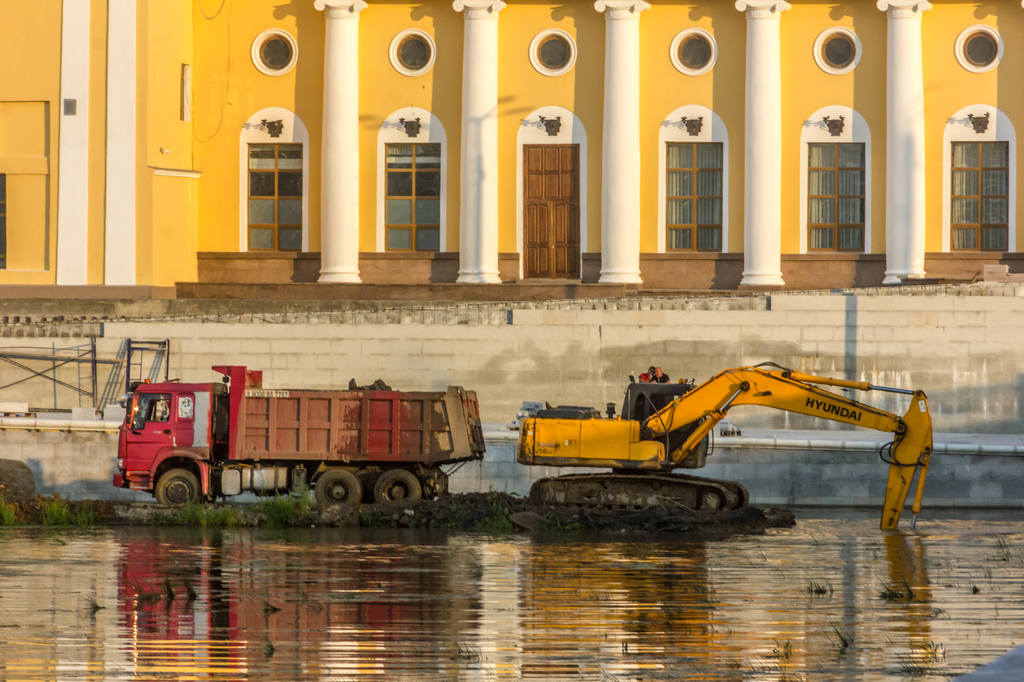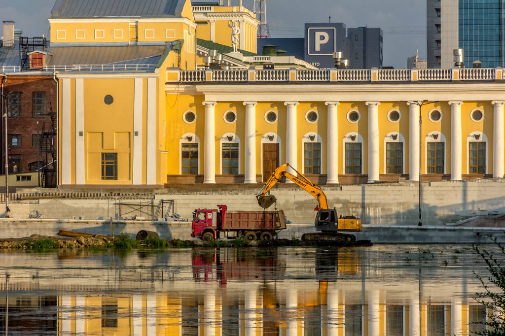 Развернулись и пошли уже по той стороне - убирают технологическую насыпь у новой набережной