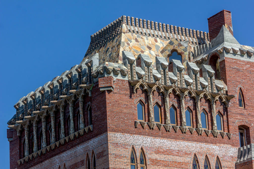 К сожалению, отснять со всех сторон не вышло - а там еще корпуса в зелени прячутся, да и забор с воротами вполне гаудианские. Надо туда будет зимой наведаться :)